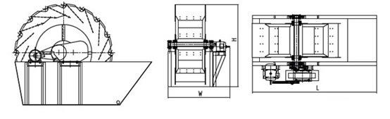 洗砂機(jī)工作時(shí),電機(jī)通過(guò)三角帶、減速機(jī)、齒輪減速后帶動(dòng)葉輪緩慢轉(zhuǎn)動(dòng),砂石有給料槽進(jìn)入洗槽中,在葉輪的帶動(dòng)下翻滾,并互相研磨,除去覆蓋砂石表面的雜質(zhì),同時(shí)破壞包覆砂粒的水汽層,以利于脫水;同時(shí)加水,形成強(qiáng)大水流,及時(shí)將雜質(zhì)及比重小的異物帶走,并從溢出口洗槽排出,完成清洗作用。干凈的砂石由葉片帶走,最后砂石從旋轉(zhuǎn)的葉輪倒入出料槽,完成砂石的清洗作用.